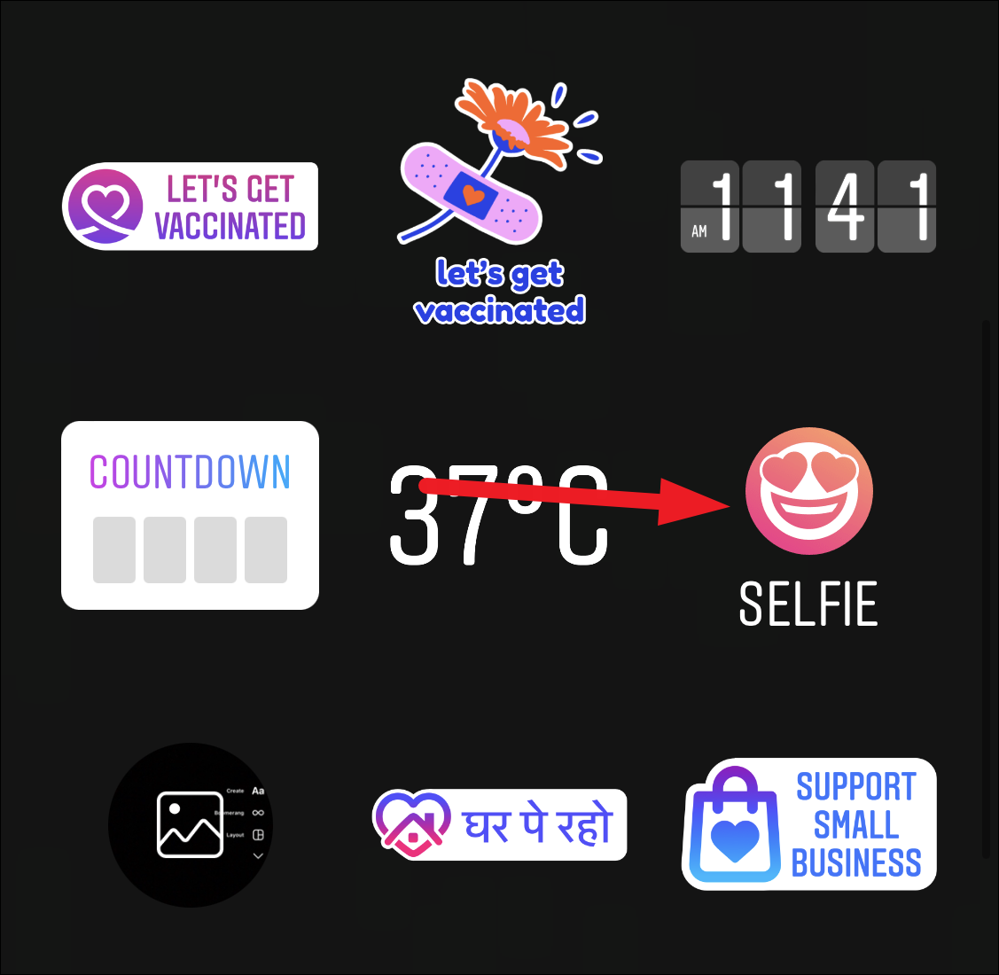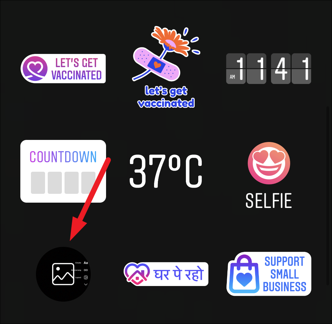 Your gallery will open. Tap one of the photos you want to add to the collage to add it to the story. To add a photo from the front camera, tap the ‘Camera’ icon / ‘Selfie’ option from the Stickers panel instead and capture the photo. You can also add stickers to the story on either device.