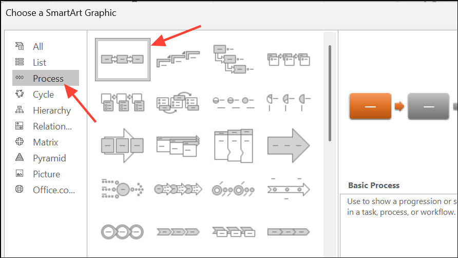 Step 2: In the left pane of the dialog, choose the Process category. Browse through the available layouts and single-click any to preview its name and description. Common options include “Basic Process” or “Picture Accent Process” if you want to include images. Click OK after selecting your preferred layout.