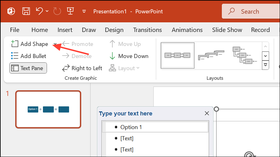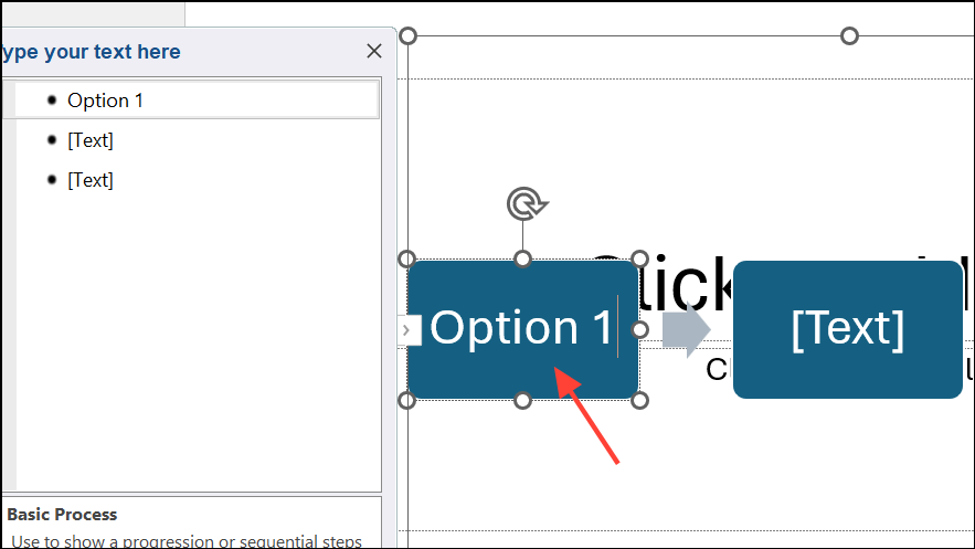 Step 3: The flowchart will appear on your slide. Replace the [Text] placeholders with the steps or elements of your process. You can enter text directly into the shapes or use the text pane (toggle it from the SmartArt Design tab if it’s not visible) for easier editing and organization.