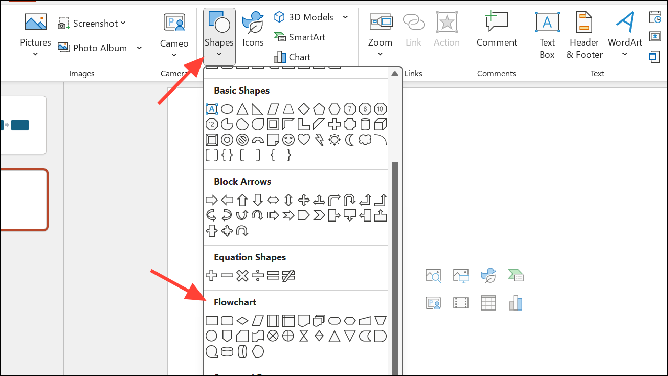 Step 1: On your target slide, open the Insert tab and select Shapes. Scroll to the “Flowchart” section to access standard symbols like process boxes, decision diamonds, data inputs, and more. Hover over each to see its function.