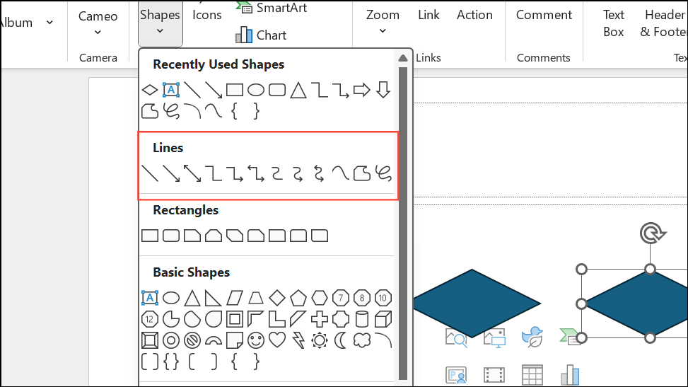Step 3: To connect shapes and define the flow, go back to Insert > Shapes and select an arrow or connector from the “Lines” section. Draw lines between shapes by clicking and dragging from one shape’s edge to another. Use anchor points for precise alignment.