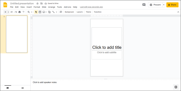To change the orientation, open Google Slides. The default orientation is landscape, with an aspect ratio of 16:9.