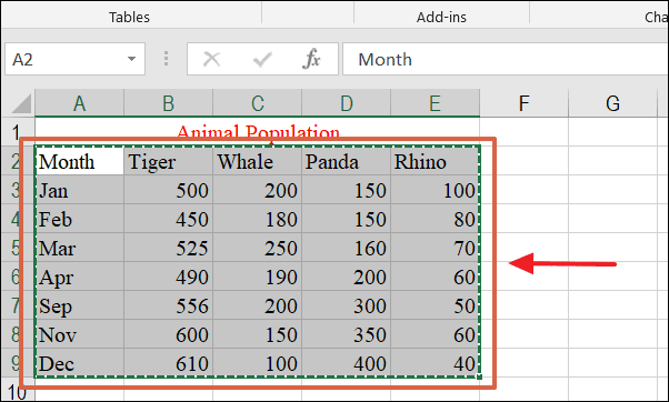 Select the data sets you wish to include in your graph by clicking and dragging across the relevant cells, as shown below.
