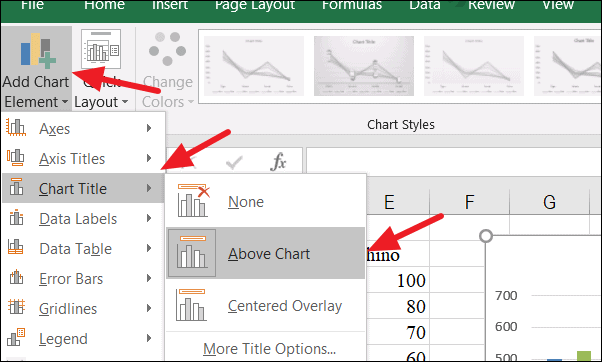 To add a title to your chart, navigate to the Design tab and click on Add Chart Element. Alternatively, you can click the plus sign next to the chart for quick access to chart elements. Expand the Chart Title option and choose either Above Chart or Centered Overlay to position your title.