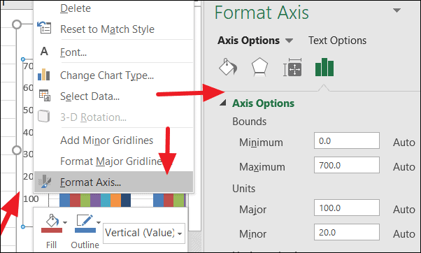 To change the values displayed on the Y-axis, right-click on the axis and select Format Axis to open the formatting pane. Under the Axis Options tab, you can adjust the Bounds and Units values to refine the scale of the axis.
