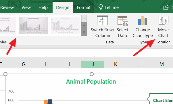 If you wish to move your chart to a different sheet within the same Excel document, go to the Design tab and click on Move Chart Location.