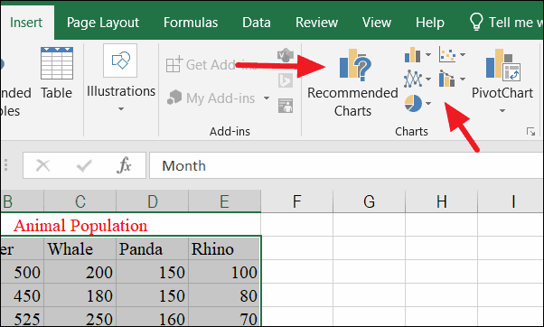To select a chart type, go to the Insert tab at the top of the Excel window and locate the 'Charts' group. Here, you will find various chart types grouped into drop-down menus. Click on an icon to expand the menu and choose your desired chart. You can also click on the Recommended Charts icon to see suggestions from Excel based on your data.