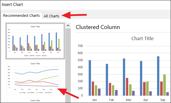 Click on any chart under the 'Recommended Charts' tab to preview how your data will appear. If none of the recommendations suit your needs, select the 'All Charts' tab to view all available chart types.