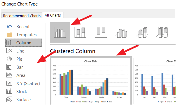Choose the chart type on the left side and select the specific style on the right. For this example, the 'Column' chart type with the 'Clustered Column' style is selected. Remember, you can change the chart type later if needed.
