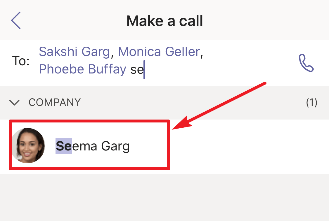 Step 3: On the Make a Call screen, enter the names of the people you want to include in the group call in the To field. Select each contact from the suggestions as they appear.