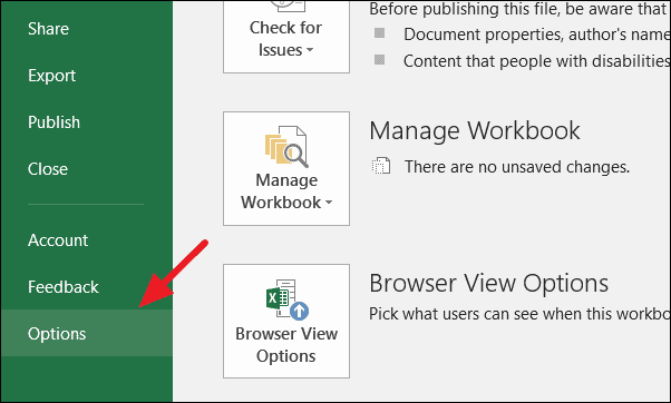 Step 2: In the backstage view, select Options to open the Excel Options dialog box.