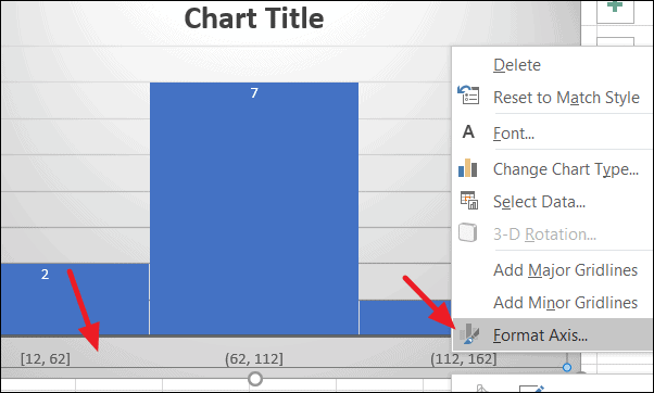Step 7: If you want to adjust the bins, right-click on the horizontal axis and select Format Axis from the context menu.