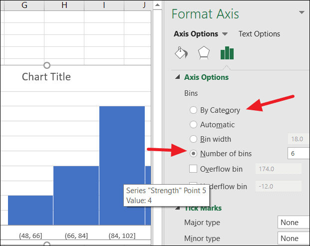 Step 8: In the Format Axis pane, you can specify the bin width, number of bins, or define custom bin ranges to refine how the data is grouped.