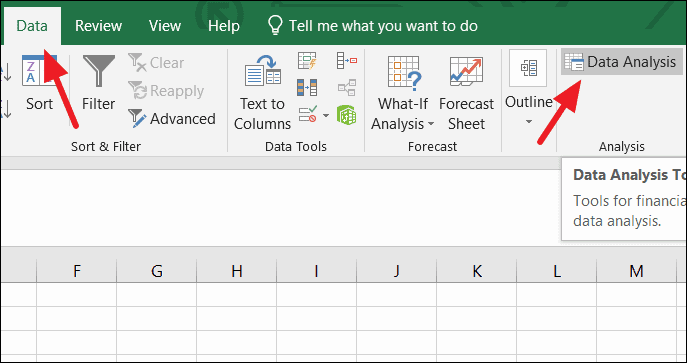 Step 2: Go to the Data tab on the Ribbon and click on Data Analysis in the Analysis group.