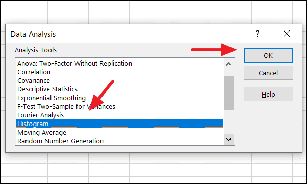 Step 3: In the Data Analysis dialog box, select Histogram from the list of analysis tools and click OK.