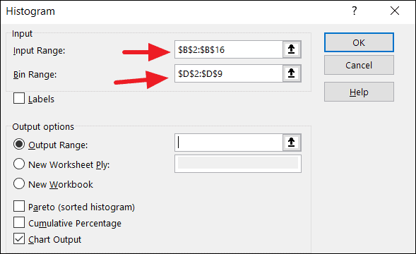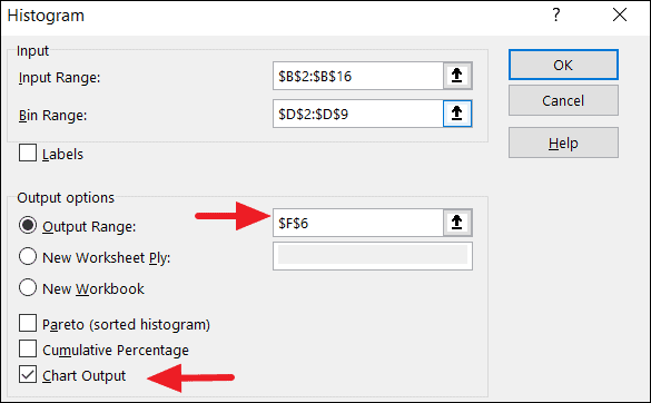 Step 5: Choose an output range by clicking on the Output Range box and selecting a cell where you want the histogram data to appear. Check the Chart Output option and click OK.