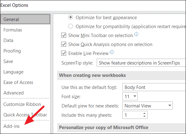 Step 3: On the left side of the Excel Options window, click on Add-ins.