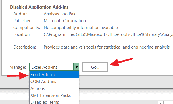 Step 4: At the bottom of the window, ensure that Excel Add-ins is selected in the Manage: dropdown menu, then click Go.