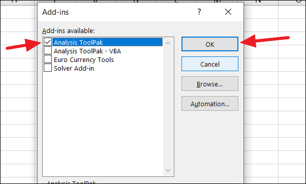 Step 5: In the Add-ins dialog box, check the box next to Analysis ToolPak and click OK to install it.