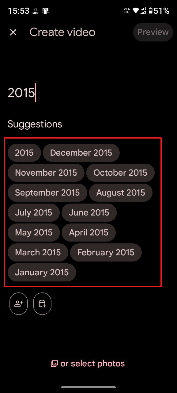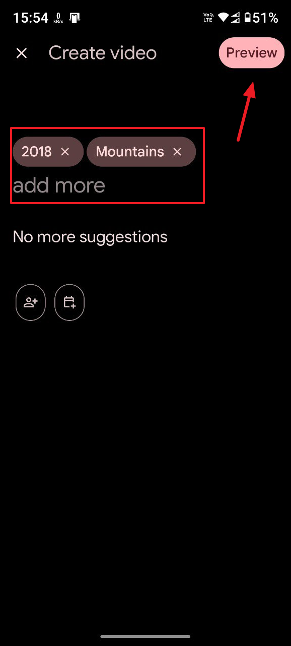 - Now, you can type in the names of the people, places, events, etc. whose photos are present in your albums to include them in the movie. When you do so, the app will offer several suggestions. Tap on them to add them to your search. You can also combine multiple people or events. Alternatively, you can select the photos you want to use manually.