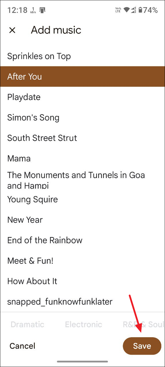 - If you choose the 'My music' option, you can select music from your device. On the other hand, the 'Theme music' option will show you a list of themes from Google. Once you've selected one, tap on the 'Save' button to add it to your movie.