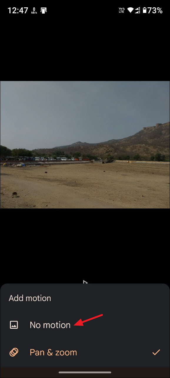 - By default, the 'Pan and zoom' option will be enabled but you can tap on the 'No motion' option to remove the animation from the video.