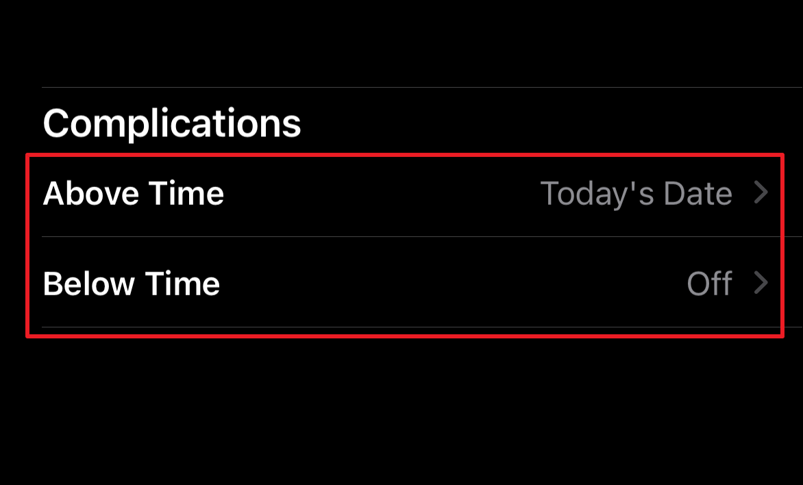 Next, to select complications for the Watch Face, locate the ‘Complications’ section and tap on the ‘Above Time’ option to choose a complication that will be displayed just above the time on your Watch Face. Similarly, tap on the ‘Below Time’ option to choose a complication that will be displayed right beneath the time.