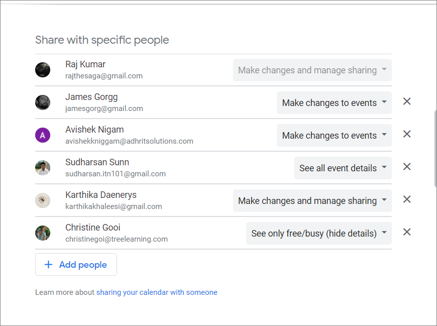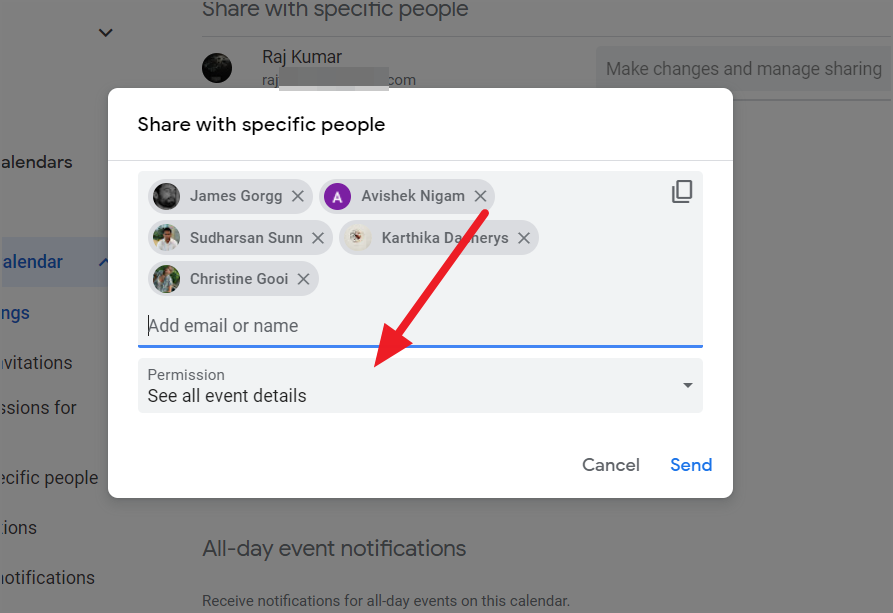 Add as many people as you want to the list. Then, click the ‘Permission’ drop-down menu to manage access to the shared calendar.