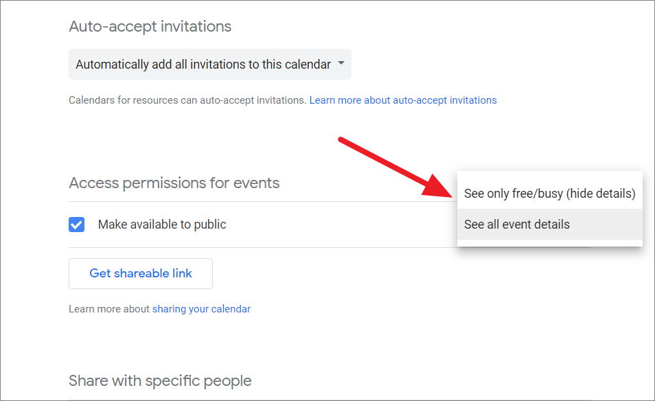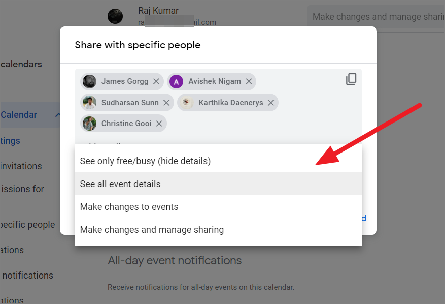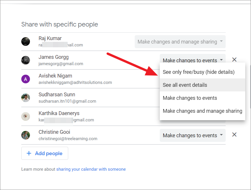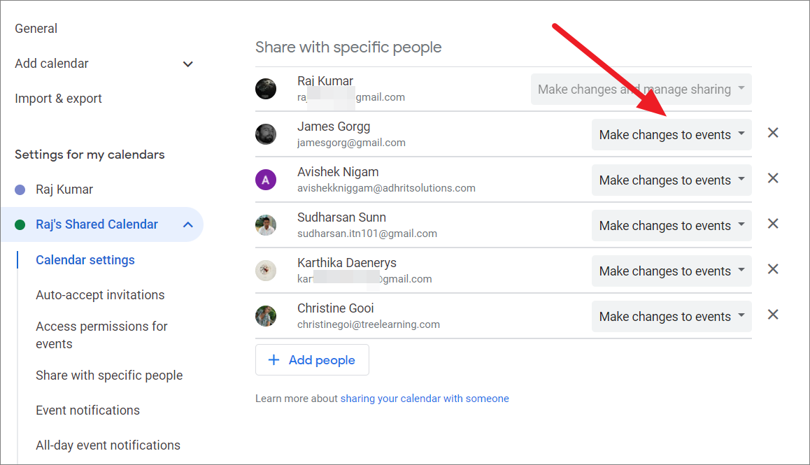 After sharing the calendar, you can change permission for individual users anytime you want. Go back to the settings of the shared calendar and click on the drop-down menu next to a specific user under the ‘Share with specific people’ section.