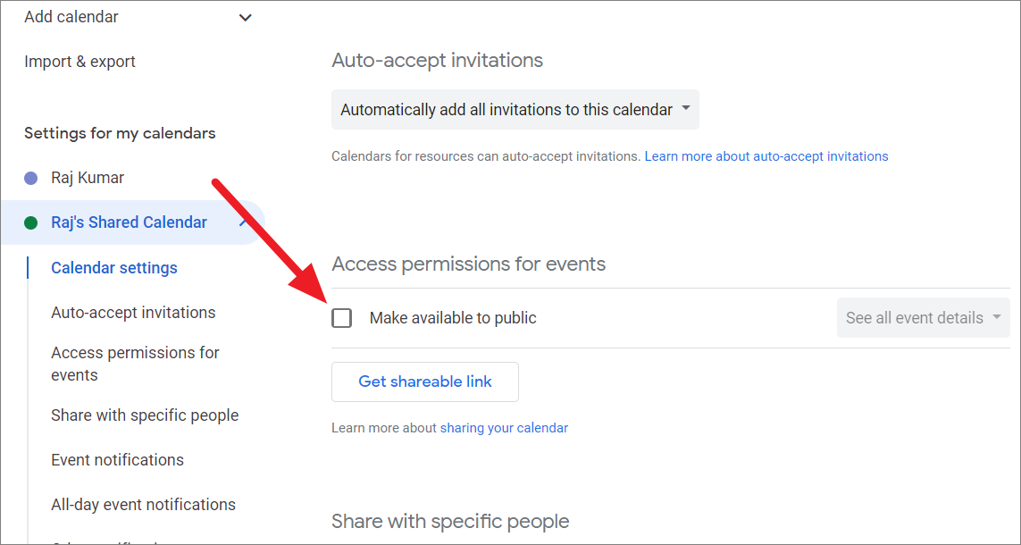 To share your calendar with specific people (friends, family, co-workers), scroll down on the Calendar settings page to the ‘Share with specific people’ section or you can just click the ‘Share with specific people’ option on the left sidebar.