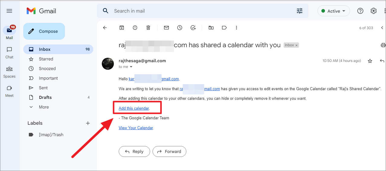 Go to your email and open the mail with the invitation. Then, simply click the ‘Add this calendar’ link on the mail.