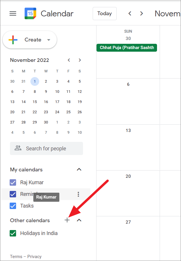 Then, click on the ‘+’ sign next to the Other Calendars in the sidebar.
