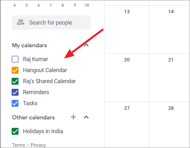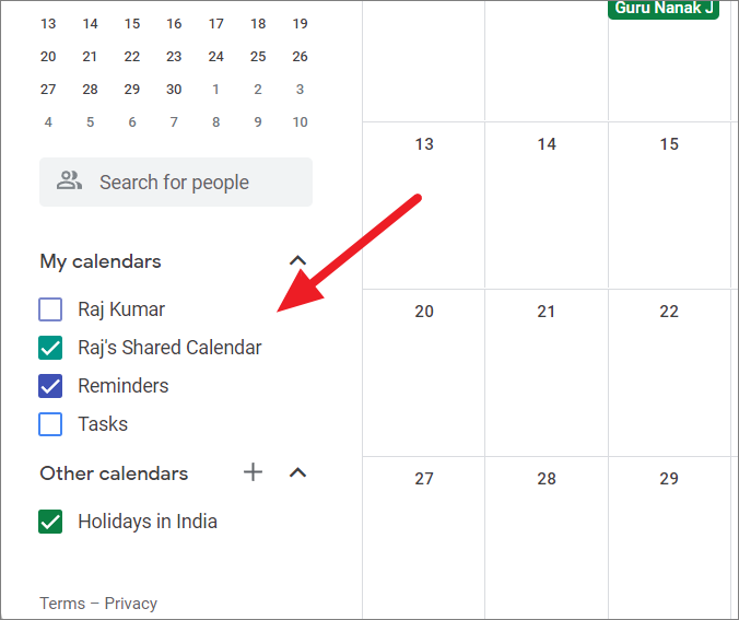 Once a shared calendar is added, it will show up in the sidebar, under the ‘My Calendars’ section. You can also click on a calendar’s name in the sidebar to toggle it on and off.