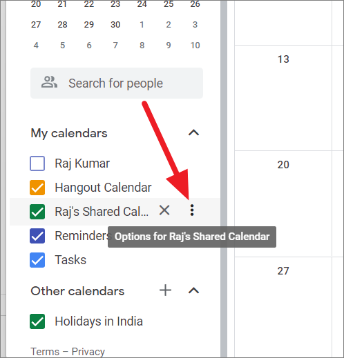 To change Calendar settings, hover over the calendar you want to share and click on the ‘Options’ (ellipsis) button.