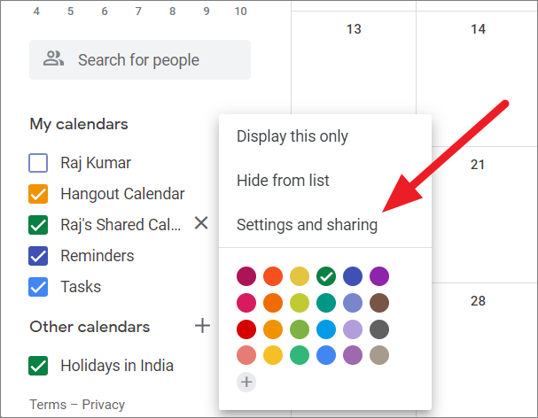 First, open Google Calendar on your browser. Under ‘My calendars’ on the left panel, hover over the calendar you want to share, click on the three-dot menu icon (vertical ellipsis), and select ‘Settings and sharing’ from the menu.