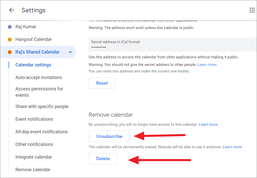 To unsubscribe from a shared calendar, go to the specific calendar settings, scroll down to the bottom of the page (Remove calendar section) and click on the ‘Unsubscribe’ button. Alternatively, you can also click the ‘X’ icon next to the calendar name under My calendars.