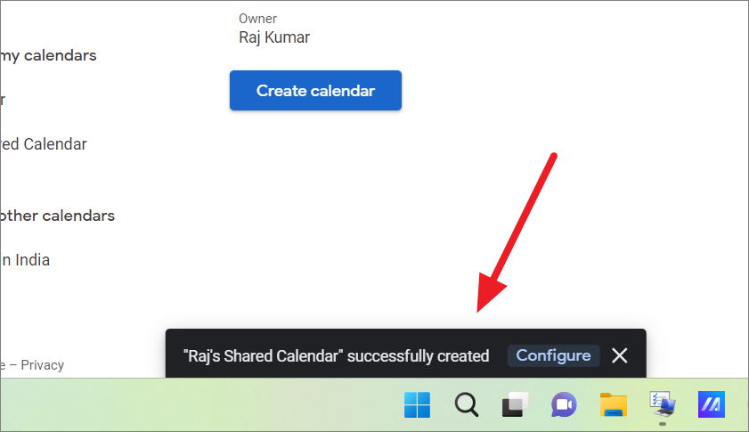 Once the calendar is created, there will be a notification at the bottom of the page as shown below. Then, go back to your calendar view. You can click the arrow button at the top left corner to get back to the Calendar view.