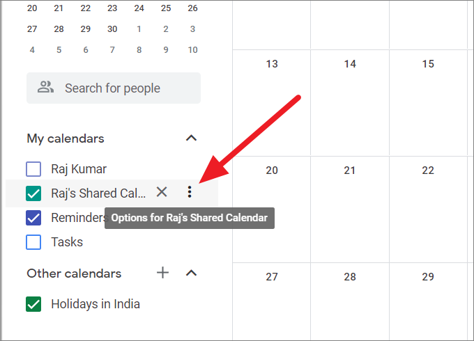 First, open your Google Calendar using calendar.google.com. Then, hover over the calendar you want to unshare and click the three vertical dots to the right.