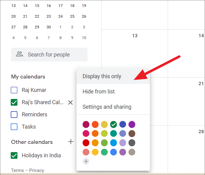 To display only this calendar on your calendar view, choose ‘Display this only’ from the menu. If you want to hide the calendar from the list, select ‘Hide from list’.
