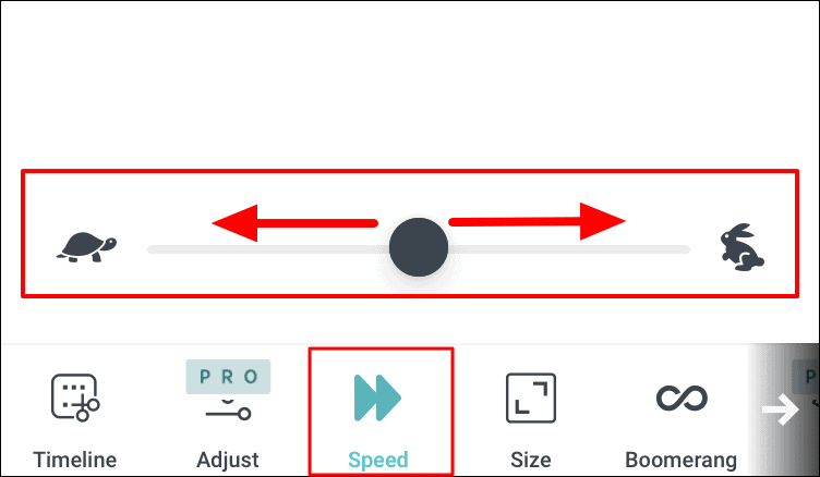 After you click on the ‘Speed’ option, a slider will appear on the screen. To change the speed of the video, drag the slider either way. Dragging the slider to the right will increase the speed of playback while moving it to the left will decrease the speed as is evident from the graphics at both ends.