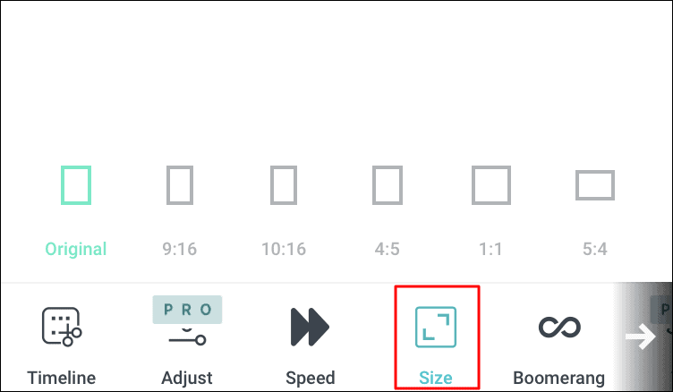 The next option is to change the size of the video. To change the size of the video, select a different aspect ratio from the ones listed on the screen just above the menu with all the tabs.