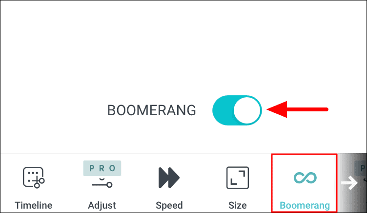 The next option is to add the boomerang effect. In the boomerang effect, the video is played first forward and then backward, thus it gets the name, ‘Boomerang Effect’. To add it, just tap on the toggle next to ‘Boomerang’ and it will be applied to the video.