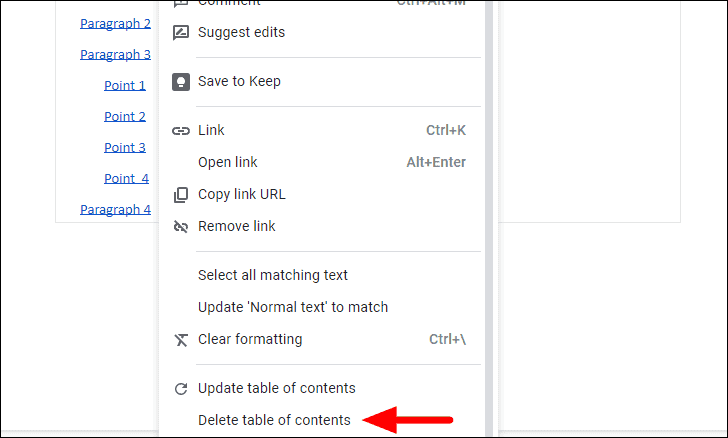 If you decide to delete the table of contents, perhaps to replace it with a different style or remove it altogether, you can do so easily. Right-click on the table of contents and select 'Delete table of contents' from the menu. The surrounding text will adjust to fill the space left by the removed table.