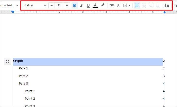 You can tailor the appearance of your table of contents to better match your document's style. Highlight the text within the table of contents that you want to modify, and use the formatting options in the toolbar to adjust the font size, style, color, and line spacing.