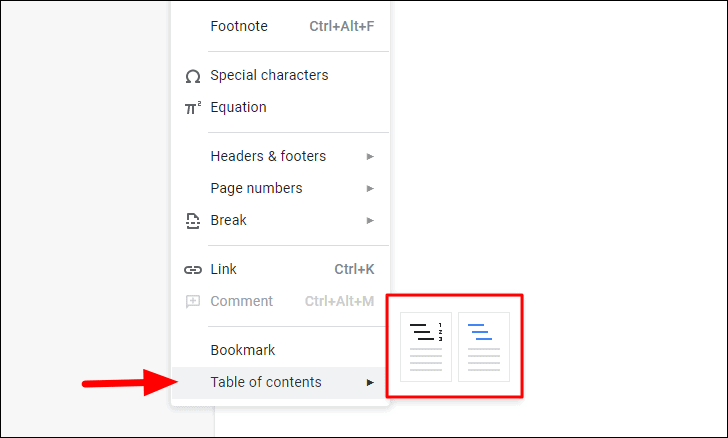 Select 'Table of contents' from the dropdown menu. A submenu will appear with the two style options: 'With page numbers' and 'With blue links'. Choose the one that suits your document.