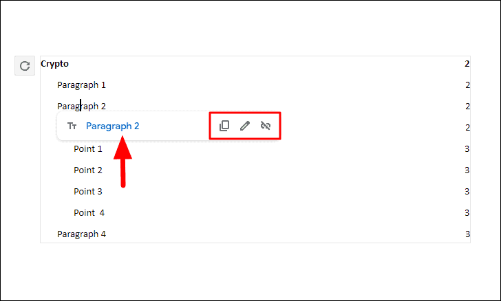 To update the table of contents, click on it to select it, then click on the 'Update table of contents' icon that appears at the top-left corner.