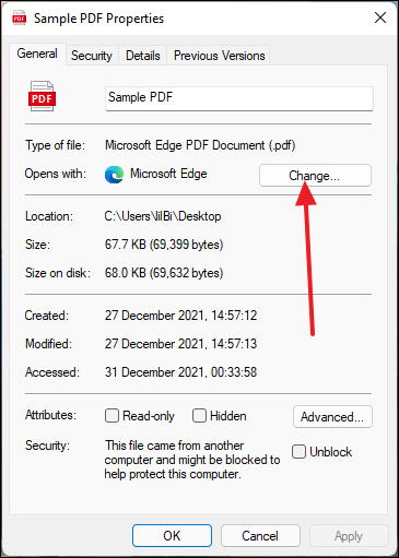 If you prefer a quicker method without navigating through multiple settings, you can change the default PDF viewer directly from a PDF file's properties menu.