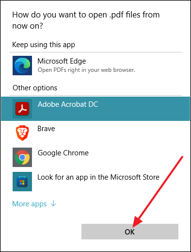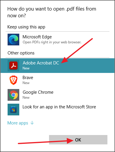 - In the How do you want to open .pdf files from now on? window, select Adobe Acrobat DC under Other options, then click OK.