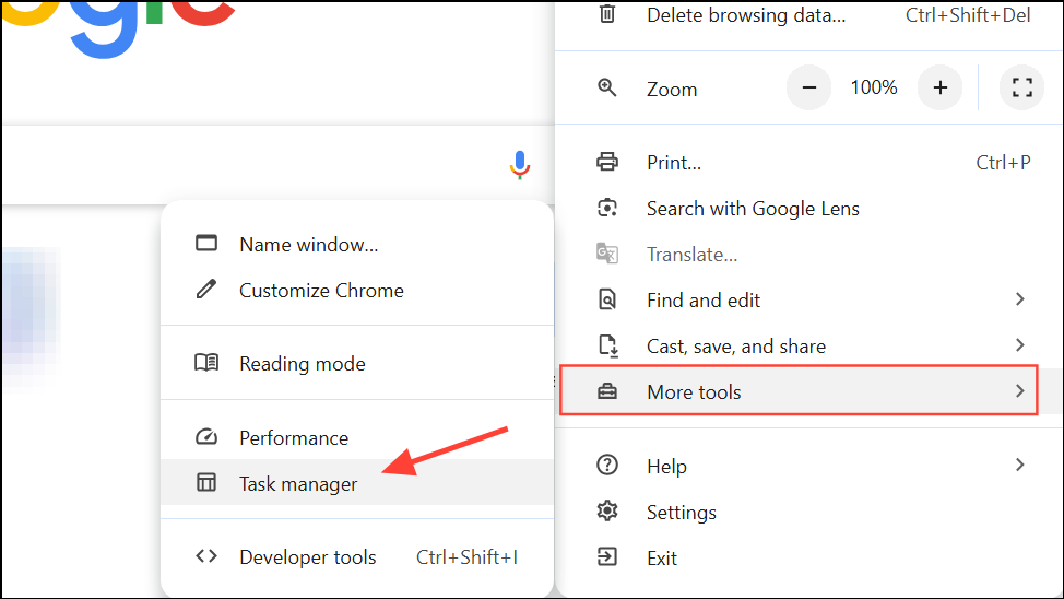 Step 1: Chrome's built-in Task Manager helps identify tabs, extensions, or processes using excessive resources. Open it by clicking the three vertical dots, navigating to More tools, and choosing Task Manager.