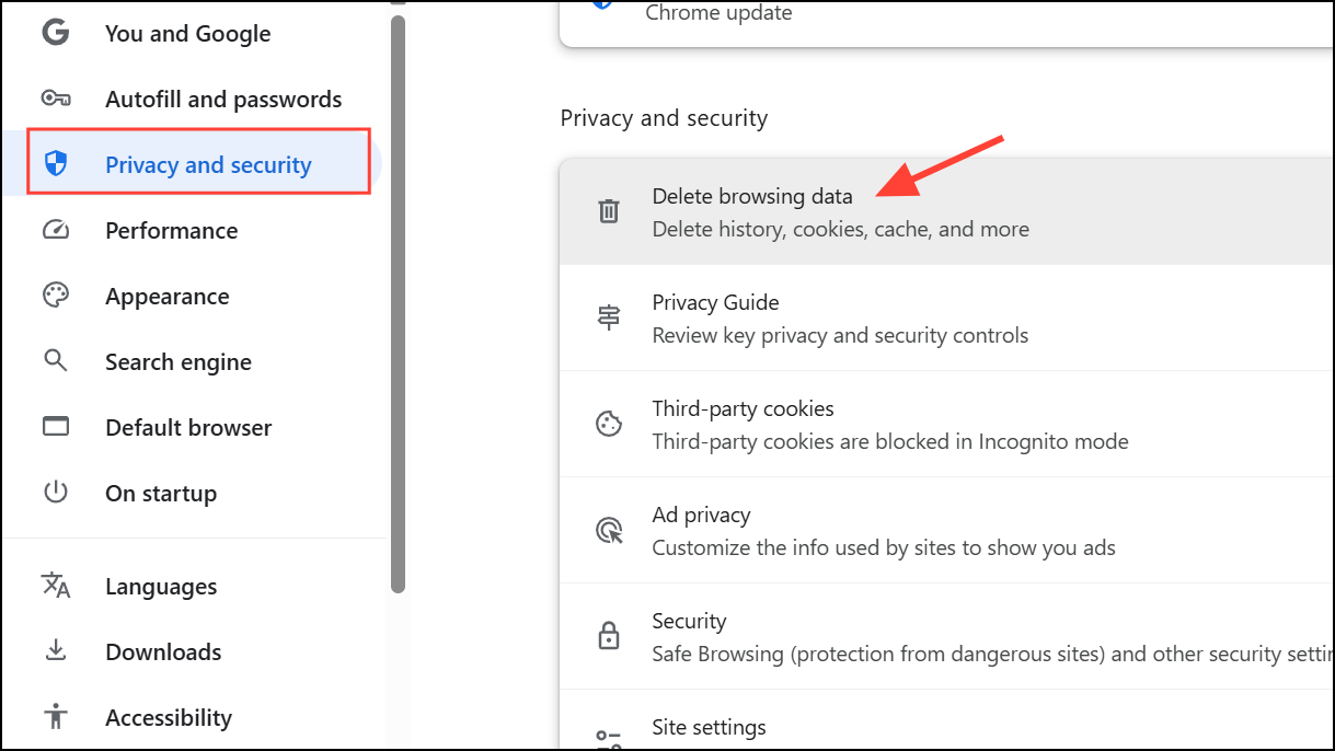 Step 2: Select Privacy and Security and click Delete browsing data.